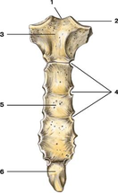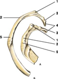 Ребро (рис. 13) представляет собой длинную губчатую кость плоской формы, изгибающуюся в двух плоскостях. Помимо собственно костной, каждое ребро имеет также хрящевую часть. Костная часть, в свою очередь, включает три явно различимых отдела: тело ребра (рис. 13), головку ребра (рис. 13) с суставной поверхностью на ней и разделяющую их шейку ребра (рис. 13).