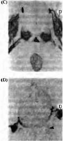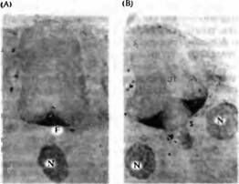 Рис. 3. Индуцированное хордой образование базальной пластинки и двигательных нейронов во время развития спинного мозга. (А и В) Специфическая окраска при помощи антител к клеткам базальной пластинки (F). (А) Нормальный эмбрион цыпленка. (В) Добавление клеток второй хорды (N) вызывает образование второй базальной пластинки. (С и D) Специфическая окраска при помощи антител к клеткам базальной пластинки, двигательным нейронам и афферентам спинального ганглия. (С) Нормальный эмбрион. (D) При удалении хорды клетки базальной пластинки и двигательной пластинки отсутствуют, а клетки спинального ганглия (D) занимают необычное вентральное положение. Аксоны сенсорных интернейронов, которые обычно идут в составе вентральной части спинного мозга, сейчас формируют пучки волокон, которые покидают спинной мозг (стрелка).