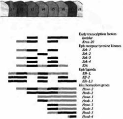 Удивительными примером подобного сходства в функционировании генов у настолько разных животных являются результаты исследований заднего мозга позвоночных. В отличие от всего остального мозга позвоночных, задний мозг эмбриона (rhombencephalon) имеет четкое сегментарное строение. Каждый сегмент его демонстрирует общий паттерн нервной дифференцировки, однако от сегмента к сегменту дифференцировка имеет свои особенности (рис. 1). Было идентифицировано несколько генов, паттерны экспрессии которых на ранних стадиях развития коррелируют с границами сегментов заднего мозга (рис. 2). Эти гены делятся на две категории: