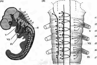 Рис. 1. Развитие заднего мозга позвоночных β виде сильно сегментированной структуры. (А) Диаграмма трехдневного эмбриона цыпленка, иллюстрирующая сегментарную организацию ромбомеров (r1-r8) в заднем мозге. (В) Паттерн организации клеток в ромбомерах r1-r7 трехдневного мозга цыпленка. Ретикулярные нейроны (слева) и брахиомоторные нейроны (справа) образуют сегментарный повторяющийся паттерн. Мотонейроны и их аксоны образуют черепно-мозговые нервы V, VII и IX пары.