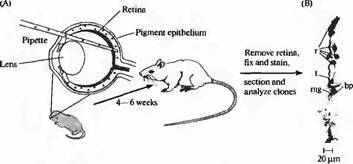 Например, когда такой вирус был введен в глаз новорожденного крысенка, а сетчатка была исследована во взрослом возрасте, белок содержали как глиальные клетки, так и несколько типов нейронов. Таким образом, общая клетка-предшественница в сетчатке при делении образует как нейрональные, так и глиальные клетки.