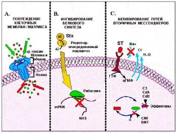 Рис. 2. Механизм действия бактериальных токсинов. А. Повреждение клеточных мембран альфа-токсином S. aureus. В. Ингибирование белкового синтеза клетки шига-токсином. С. Примеры бактериальных токсинов, активирующих пути вторичных мессенджеров (функциональные блокаторы).