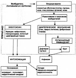 Рис. 1. Схема патогенеза дифтерии (слева). При дифтерии коринебактерии (справа) не проникают за пределы входных ворот инфекции.