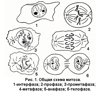 Наиболее широко распространенная форма воспроизведения клеток у живых организмов — непрямое деление, или митоз (рис. 1.). Для митоза характерны сложные преобразования ядра клетки, сопровождающиеся формированием специфических структур - хромосом. Хромосомы постоянно присутствуют в клетке, но в период между двумя делениями — интерфазе — находятся в деспирализованном состоянии и потому не видны в световой микроскоп. В интерфазе осуществляется подготовка к митозу, заключающаяся главным образом в удвоении (редупликации) ДНК. Совокупность процессов, происходящих в период подготовки клетки к делению, а также на протяжении самого митоза, называется митотическим циклом. После завершения деления клетка может вступить в период подготовки к синтезу ДНК, обозначаемый символом G1. В это время в клетке усиленно синтезируются РНК и белки, повышается активность ферментов, участвующих в синтезе ДНК. Затем клетка приступает к синтезу ДНК. Две спирали старой молекулы ДНК расходятся, и каждая становится матрицей для синтеза новых цепей ДНК. В результате каждая из двух дочерних молекул обязательно включает одну старую спираль и одну новую. Новая молекула абсолютно идентична старой. В этом заключается глубокий биологический смысл: таким путем в бесчисленных клеточных поколениях сохраняется преемственность генетической информации.