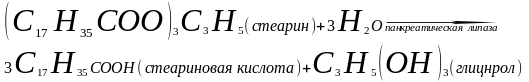 Переваривание жиров начинается в тонком отделе кишечника, где панкреатическая липаза с помощью желчных кислот и белка колипазы конвертирует жиры в глицерол и жирные кислоты. Одна молекула жира дает одну молекулу глицерола и три молекулы жирной кислоты: