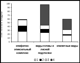 На рисунке 4 показано, что виды групп 1 и 2 преобладают среди эпифитов и эпиксилов. В то же время, почва лесных сообществ и, особенно, каменистые субстраты представляют собой стабильные условия существования, к которым хорошо приспособлены виды мохообразных с преимущественно вегетативным способом размножения, а также виды, не имеющие специализированных органов вегетативного размножения и редкими (или отсутствующим в регионе) спороношением (группы 3 и 4).