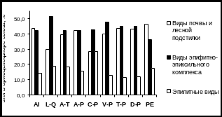 Данные рисунка 2 показывают, что для бриоценофлор южно-уральских лесных сообществ характерно высокое участие эпилитов (от 11 до 29 % в разных союзах). Преобладание видов эпифитно-эпиксильного комплекса над напочвенными видами отмечено для сообществ союзов Lathyro-Quercion, Caragano-Pinion и Veronico-Pinion, в которых развитию напочвенных мохообразных препятствуют засушливые условия местообитания и, в ряде случаев, высокая сомкнутость травяного яруса. Повышенное разнообразие эпигейных видов характерно для ельников-зеленомошников (союз Piceion excelsae).