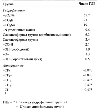Концепция чисел ГЛБ Гриффина впоследствии была развита Дэвисом, который ввел схему, позволяющую приписывать групповые числа ГЛБ химическим группам, составляющим молекулу ПАВ. Формула Девиса и значения некоторых типичных групповых чисел приведены в табл. 1. Из этой таблицы видно, что сульфатная группа потенциально намного более полярна, чем карбоксильная, и что концевая гидроксильная группа полиоксиэтиленовой цепи более гидрофильна, нежели гидроксильная группа Сахаров.