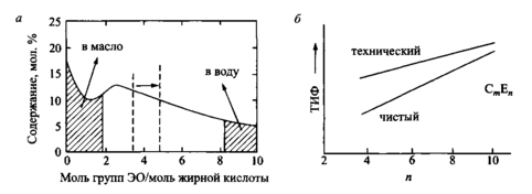Физико-химические свойства неионных ПАВ с полиоксиэтиленовыми цепями сильно зависят от температуры. Одно и то же ПАВ может стабилизировать эмульсии с водой в качестве дисперсионной среды при низких температурах и с маслом в качестве дисперсионной среды при высоких температурах. Концепция, в основе которой лежит температура инверсии фаз, определила более количественный подход для оценки эмульсионных систем, стабилизированных ПАВ. Принята следующая процедура для определения ТИФ: эмульсию масла в воде, содержащей -5% неионного ПАВ, встряхивают при повышении температуры. Температуру, при которой происходит инверсия фаз и эмульсия «масло в воде» переходит в эмульсию «вода в масле» определяют как ТИФ системы. Инверсию фаз можно легко определить по резкому падению электропроводности, когда эмульсия с водной дисперсионной средой трансформируется в эмульсию с масляной дисперсионной средой.