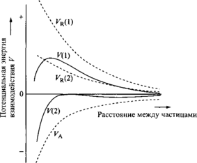 На рис. 6 показаны кривые энергии взаимодействия для двух ситуаций. Энергия притяжения одинакова в обоих случаях, а электростатическое отталкивание сильное и слабое. Результирующая кривая J7 имеет максимум отталкивания, а на кривой V такой максимум отсутствует.