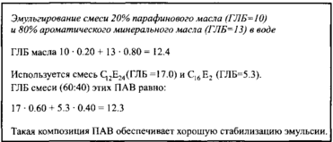 В процессе эмульгирования эмульгатор или комбинация эмульгаторов должны быть выбраны с числом ГЛБ, равным числу ГЛБ фазы, которую нужно эмульгировать. При использовании смесей ПАВ ее ГЛБ определяется как средневзвешенное число из чисел ГЛБ индивидуальных ПАВ. Пример использования метода ГЛБ для выбора эмульгатора приведен на рис. 7.