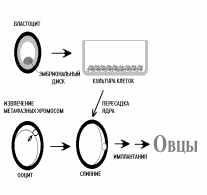 | | Рис. 1. Методика, с помощью которой Кэмпбелл и его коллеги клонировали овец. Из клеток эмбрионального диска получили устойчивые культуры клеток. Из ооцитов-реципиентов удаляли часть цитоплазмы вместе с метафазной пластинкой и индуцировали слияние таких безъядерных |