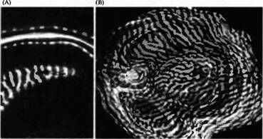 | Рис. 8. Глазодоминантные колонки в коре обезьяны, полученные при помощи введения радиоактивного про лина в один глаз. Ауторадиограммы, снятые при темнопольном освещении, где белым показаны зерна серебра. (А) Сверху рисунка срез проходит через слой 4 зрительной коры под углом к поверхности, образуя перпендикулярный срез колонок. В центре слой 4 был срезан горизонтально, показывая, что колонка состоит из удлиненных пластинок. (В) Реконструкция из множества горизонтальных срезов слоя 4С у другой обезьяны, у которой инъекция проводилась в илсилатеральный глаз. (Любой горизонтальный разрез может выявить | лишь часть слоя 4, что обусловлено кривизной коры.) Как в А, так и в В колонки зрительного доминирования выглядят как полоски равной ширины, получающие информацию либо от одного, либо другого глаза. |