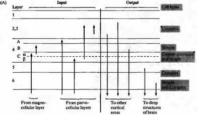Исходящие из слоев 6, 5, 4, 3 и 2 волокна показаны справа на рис.7А. Клетки, посылаюшие эфферентные сигналы из коры, могут также управлять внутри корковыми соединениями между разными слоями. Например, аксоны клетки из слоя 6, кроме ЛКТ, могут также направляться в один из других кортикальных слоев, в зависимости от типа ответа этой клетки34). На основании подобного строения зрительных путей можно представить следующий путь зрительного сигнала: информация с сетчатки передается на клетки коры (в основном, в слой 4) аксонами клеток ЛКТ; информация передается из слоя в слой, от нейрона к нейрону по всей толщине коры; переработанная информация пересылается в другие зоны коры при помощи волокон, направляющихся вглубь белого вещества и возвращающихся обратно в область коры. Таким образом, радиальная или вертикальная организация коры дает нам основания полагать, что колонки нейронов работают как отдельные вычислительные единицы, обрабатывая различные детали зрительных сцен и пересылая полученную информацию далее в другие регионы коры.
