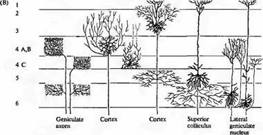 Основной особенностью коры млекопитающих является то, что клетки здесь расположены в виде 6 слоев в пределах серого вещества (рис. 6А). Слои сильно различаются по внешнему виду, в зависимости от плотности расположения клеток, а также толщины каждой из зон коры. Входящие пути показаны на рис. 7A с левой стороны. Исходя из ЛКТ, волокна в основном заканчиваются в слое 4 с небольшим количеством связей, образуемых также в слое 6. Поверхностные слои получают сигналы из области подушки таламуса (pulvinar zone) или других зон таламуса. Большое количество клеток коры, особенно в области слоя 2, а также в верхних частях слоев 3 и 5 получают сигналы от нейронов, также расположенных в пределах коры. Основная масса волокон, идущих от ЛКТ в слой 4, затем разделяется между различными подслоями.