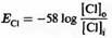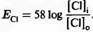 Допустим теперь, что в мембране, кроме калиевых, присутствуют еще и хлорные каналы. Поскольку для анионов z = - 1, получим равновесный потенциал для хлора: