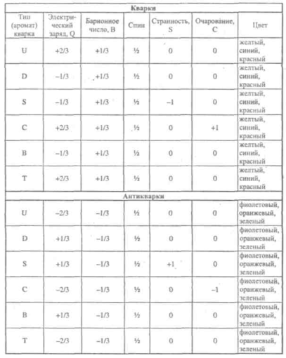 Знание характеристик адронов позволяет осуществить их классификацию и соответствующую классификацию кварков. Из принятой структуры барионов В a (qqq) следует, что каждому кварку нужно приписать барионное число В = +1/3 (соответственно, антикварку — В = -1/3). Для того чтобы получить полуцелый спин у бариона, необходимо, чтобы у кварка спин был равен 1/2. Электрические заряды кварков получаются в соответствии с формулой Гелл-Манна-Нишиджимы, и они оказываются дробными, кратными одной трети от заряда электрона (одно из многих удивительных свойств кварков). Сейчас физики предполагают существование 6 типов («ароматов») кварков. Первая тройка кварков — и, d, s (соответственно от слов up — верхний, down — нижний, strange — странный). Электрический заряд Q у u-кварка равен +2/3, у d- и s-кварков Q = -1/3 заряда электрона. Немного позднее, после того как уже появилась гипотеза кварков, в 1965 году, было высказано предположение, что каждый из кварков может быть представлен тремя разновидностями, различающимися особой характеристикой, названной «цветом». Итак, если в природе существует 6 разновидностей кварков и у каждого из них могут быть 3 «цвета», то получается всего 18 разновидностей кварков и столько же антикварков.