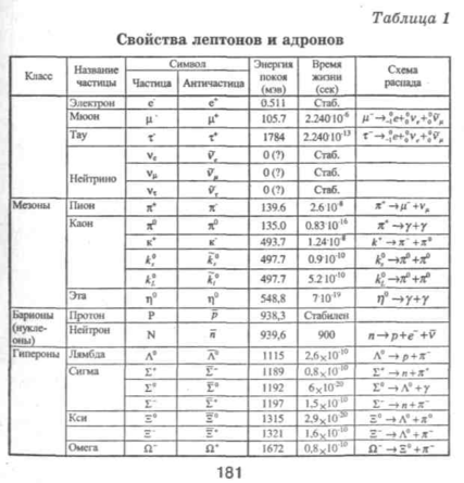 Как об этом упоминалось ранее, другие элементарные частицы — лептоны, не подвержены сильному взаимодействию, они испытывают только электромагнитное и слабое взаимодействия. При определенных энергиях частиц (лептонов) электромагнитное и слабое взаимодействия сливаются, образуя электрослабое взаимодействие. Теория электрослабых взаимодействий была разработана С. Вайнбергом, Ш. Глэшоу и А. Саламом. Для иллюстрации многообразия свойств элементарных частиц и с целью информации о них, приведем таблицы 1 и 2 некоторых лептонов, адронов и кварков, соответственно.