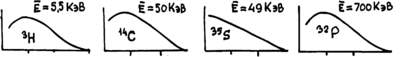 Это хорошо видно из графиков распределения по энергиям электронов, представленных на рис. По осям абсцисс на этих графиках отложены величины энергии в КэВ, естественно, в разных масштабах (см. цифры). По осям ординат относительное содержание электронов указанной энергии. (Кривые не доходят до оси ординат, так как энергии электронов, близкие к нулю не поддаются измерению) Указанные значения Е соответствуют средней величине энергии электронов соответствующего изотопа, на которую следует ориентироваться при оценке возможностей их регистрации.