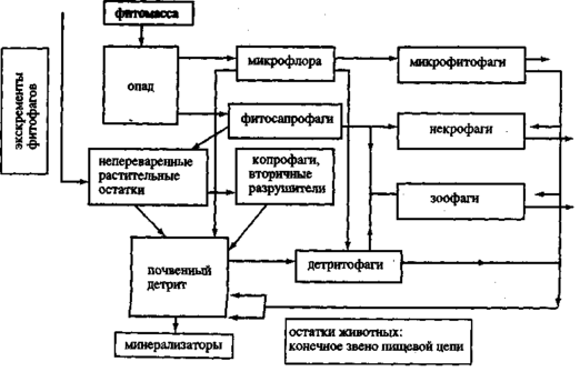 Рисунок 1. Схема детритной пищевой цепи в почве (по Б. Р. Стригановой, 1980)