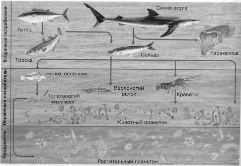 В состав биоценоза всегда входит очень много видов самого разного уровня организации - от бактерий до позвоночных. Их взаимоотношения в первую очередь определяются пищевыми потребностями. Таким образом, пищевые отношения служат регулятором численности видов, входящих в биоценоз. Столь же разнообразно население морей (рис. 3).