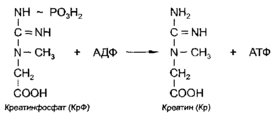 В мышечных клетках всегда имеется креатинфосфат - соединение, содержащее фосфатную группу, связанную с остатком креатина макроэнергической связью. Содержание креатинфосфата в мышцах в покое - 15-20 ммоль/кг. Креатинфосфат обладает большим запасом энергии и высоким сродством к АДФ. Поэтому он легко вступает во взаимодействие с молекулами АДФ, появляющимися в мышечных клетках при физической работе в результате гидролиза АТФ. В ходе этой реакции остаток фосфорной кислоты с запасом энергии переносится с креатинфосфата на молекулу АДФ с образованием креатина и АТФ:
