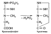 Креатинфосфат, обладая большим запасом химической энергии, является веществом непрочным. От него легко может отщепляться фосфорная кислота, в результате чего происходит циклизация остатка креатина, приводящая к образованию креатинина: