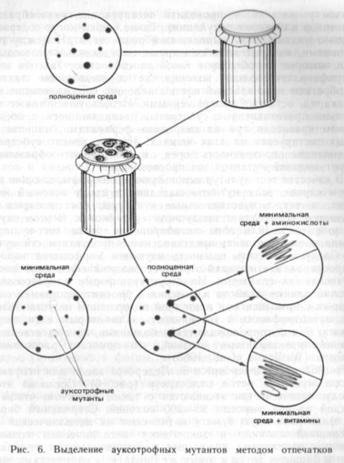 В 1952 г. Д. Ледерберг и Э. Ледерберг ввели для непрямого отбора мутантов метод отпечатков (рис. 6). Согласно этому методу, чашки Петри засеваются с таким расчетом, чтобы на каждой из них выросло 50—200 колоний. Стерильный бархат или фильтровальную бумагу натягивают на металлический или деревянный цилиндр и закрепляют металлическим кольцом. Чашки с выросшими колониями переворачивают и прикладывают к бархату. Затем к этому же бархату (с отпечатками колоний на нем) прикладывают чистые чашки с различными средами. После соответствующей инкубации на них образуются колонии в том же расположении, что и на исходной (матричной) чашке. Если матричная чашка содержала полноценную среду, то отпечатками на минимальные среды можно выявить ауксотрофные мутанты. Различные модификации этого метода широко используются для выделения мутантов с питательными потребностями, а также мутантов, чувствительных к различным физическим, химическим и биологическим агентам (температура, антибиотики, фаги и др.).