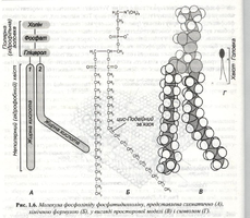 Відповідно до цієї моделі, основу мембран складає подвійний ліпідний шар, у якому присутні ліпіди трьох типів - фосфоліпіди, холестерол, і гліколіпіди. Усі вони відносяться до амфіпатичних молекул. Так, наприклад типова молекула фосфоліпіду має полярну головку (рис 1.6), основу якої складає гліцерил і два гідрофобних вуглеводневих хвости, представлені насиченими чи ненасиченими жирними кислотами.