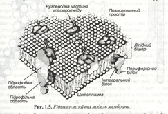 В 1972 році С.Сінгер і Г.Ніколсон запропонували рідинно-мозаїчну модель структури біологічних мембран.(рис 1.5).