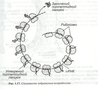 Установлено, що на рибосомах відбувається біосинтез білка, тобто зв’язування активованих амінокислот і укладення їх у поліпептидний ланцюг відповідно до генетичної інформації, отриманої з ядра через інформаційну РНК. На поверхні іРНК відбувається взаємодія між комплексами « амінокислота – транспортна РНК» і самою рибосомою. З рибосомами одночасно можуть з’єднуватися тільки два комплекси і замикається тільки один пектиновий зв'язок. Потім рибосома переміщується по іРНК, до неї підходить наступний комплекс «амінокислота – тРНК» і замикається новий пептидний зв'язок. Так продовжується до закінчення синтезу поліпептидного ланцюга. Цей процес називається трансляцією. Рибосоми діють в основному не ізольовано, а спільно й упорядковано. Угрупування рибосом, що транслює іРНК і синтезує той самий білок, одержало назву полісоми. В одній полісомі може знаходитися від 5 до 70 рибосом. На ЕПС полісоми виявляються у вигляді характерних завитків (рис.1.17).