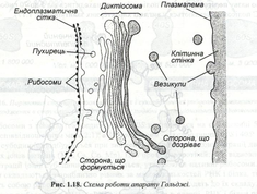 Структуру, відому тепер як апарат Гольджі уперше знайшов у тваринних клітинах у 1898 р. італійський гістолог К. Гольджі. Однак у рослинних клітках існування подібних структур було достовірно встановлене в результаті робіт із застосуванням електронного мікроскопа Бюва і Портером лише в 1957 році. Апарат Гольджі. Являє собою купку сплощених мембранних мішечків, так званих цистерн, і зв’язану з ними систему пухирців, які називають пухирцями Гольджі, чи везикулами. Ряд окремих купок називають диктіосомами. (рис. 1.18).