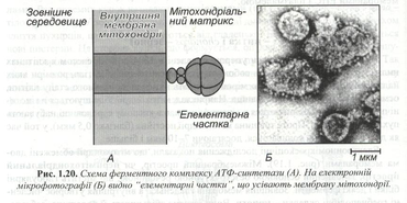 Сучасні методи дозволили виявляти присутність особливих «елементарних часток» на внутрішній мітохондріальній мембрані (рис.1.20). Це ферменти АТФ - синтетази, що забезпечують сполучення фосфорилювання АДФ із реакціями в дихальному ланцюзі.