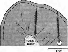 Рис. 3. Оси ориентации рецептивных полей нейронов по мере погружения электрода вглубь коры мозга кошки. Все последующие клетки демонстрируют одинаковую ориентацию оси, что показано в виде угла, под которым располагается штриховая полоска по отношению к линии проникновения электрода. Погружение электрода справа идет с большим отклонением от перпендикуляра, следовательно, при пересечении им нескольких колонок часто меняется и ориентация оси. Расположение каждой клетки определяется при помощи нанесения небольших повреждений по мере погружения электрода и при завершении погружения (показано кружком). На основании этих данных производится реконструкция хода электрода. Подобные эксперименты позволили установить, что клетки со сходными свойствами у кошек и обезьян организованы в виде колонок, идущих под определенными углами к поверхности коры.