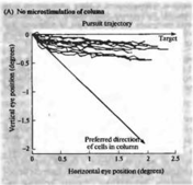 Каким же образом рассчитывается движение в зоне МТ? Колонки в этой зоне представляют собой кластеры клеток, одинаково реагирующих на сходное направление движения вдоль ретинотопической карты. Таким образом, движение объекта вдоль сетчатки должно активировать те колонки, которые имеют ориентацию, совпадающую с направлением движения объекта. Но движущиеся зрительные объекты активируют не только одну подобную колонку. Чаще всего они имеют замысловатую траекторию движения, вызывая активацию большого набора нейронов, чувствительных к различным направлениями движения и к разным его углам. Стало быть, для оценки такого движения и расчета усредненного вектора движения потребуются нейрональные вычисления. Нейрональные вычисления, осуществляемые колонками, чувствительными к направлению движения объекта, изучались Ньюсомом с коллегами, с использованием электрической микростимуляции для управления движения глазом у тренированных обезьян. При помощи микроэлектрода регистрировалось предпочтительное направление движения для данной колонки клеток, а затем этот электрод использовался для инъекции небольшого по величине тока для активирования данной колонки в то время, когда осуществлялось следящее движение глазом (рис. 6). После этого проводили сравнение следящего движения глаза без стимуляции и при стимуляции МТ, для того чтобы узнать, каким образом происходит сложение двух различных направлений движения в пределах зрительного поля. В контроле глаз строго следует за объектом (рис.6А). При стимуляции электрическим током колонки МТ, предпочтения относительно движения которой отличались от направления движения объекта, результирующее движение глаза было средним между двумя этими направлениями (рис. 6В). Вывод: траектория движения используется для расчета среднего вектора для активированных колонок, отслеживающих направление движения. Привлекательной особенностью таких экспериментов является то, что поведение обезьяны (движение глаз) представляет собой тип анализа, выполняемый в высших корковых центрах Уже давно предполагалось, что подобный расчет среднего вектора используется при выполнении резкого отрывистого движения глаз.
