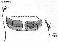 Первым доводом против того, что уменьшение зрительной активности может привести к изменениям в работе нейронов, являются данные эксперимента, когда у детеныша обезьяны, новорожденного или рожденного путем кесарева сечения, закрывали сразу оба глаза. Исходя из предыдущего обсуждения, можно сделать предположение, что клетки в коре не будут управляться ни одним глазом. Однако, к удивлению, после бинокулярной депривации на протяжении 17 дней и дольше большинство корковых клеток выглядело полностью нормальными. Колонки ориентации имели строение, близкое к таковому у контрольной группы (рис. 1). Основным нарушением было то, что значительная часть клеток не получала бинокулярного управления (рис. 1). Кроме того, некоторые спонтанно активные клетки вообще не получали никакого управления, другим же для активности не требовался определенным образом ориентированный стимул. Тем не менее зоны коры, контролируемые обоими глазами, оставались равными в размерах, имея паттерн, аналогичный тому, что наблюдается у нормальных взрослых обезьян: в слое 4 клетки управлялись только одним глазом, четко определялись колонки при использовании авторадиографии или окраски на цитохромоксидазу. Бинокулярная депривация у котят приводила к сходным эффектам, за исключением того, что количество клеток, получающих бинокулярное управление, оставалось большим. При этом также не происходило уменьшение ветвистости аксонов ЛКТ, направляющихся в слой 4 коры. В то же самое время клетки всех слоев в пределах ЛКТ подвергались атрофии (уменьшению в размерах примерно на 40 %).
