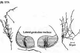 Эти эксперименты представляют собой пример, когда все обычные параметры освещения в норме: количество попадающего в глаз света и паттерн стимуляции. Единственным отличием от нормы является то, что свет не падает на корреспондирующие регионы двух сетчаток. Фактором, который, скорее всего, приводит к потере бинокулярной конвергенции проекций отростков ЛКТ в кору, является недостаток соответствия в импульсах от обоих глаз. То есть гомологичные рецептивные поля обоих глаз должны быть скоординированы, чтобы возбуждение происходило одновременно. Последующие эксперименты говорят в пользу такой идеи.