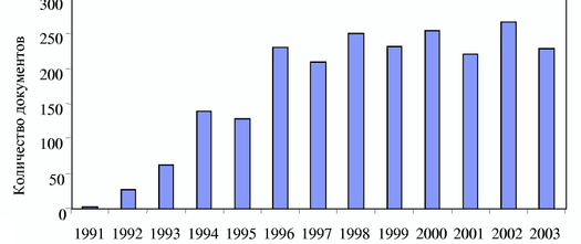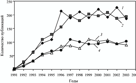 Несмотря на трудности, которые отечественная наука переживала в рассматриваемый период, в области исследований по фуллеренам Россия в четверке мировых лидеров [8]. Важную роль в объединении разрозненных усилий российских ученых и выделении проблемы в отдельную научную область сыграло формирование программного направления «Фуллерены и атомные кластеры» в рамках ГНТП «Актуальные направления в физике конденсированных сред» (1994 г.), а также поддержка учрежденного несколько ранее РФФИ. Это стимулировало создание российского сообщества исследователей, занимающихся проблемой изучения и применения фуллеренов. Динамику интереса к данной проблематике, формирования конкурентоспособных научных коллективов отражают рис. 2 и 3.