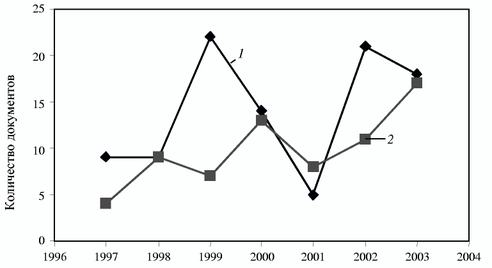 Рис. 4. Динамика выданных российских патентов (7), диссертаций (2), утвержденных ВАК России
