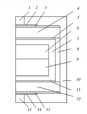 1, 15 — токоподводы; 2, 14 — электрофокусы; 3, 5, 11, 13 — теплоразводящие диски; 4, 12 — верхний и нижний нагревательные диски; 7, 10 — электро- и теплоизоляционные втулки; 8 — трубчатый нагреватель; 6 — источник углерода; 9 — металл-растворитель