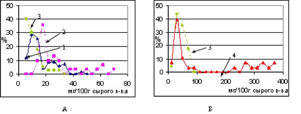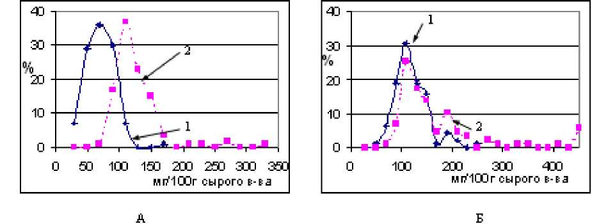 Анализ изученных популяций показал, что в каждой популяции люцерны можно выделить растения существенно различающиеся своей реакцией на изменение погодных условий. В тоже время, в каждой популяции была группа растений, в которой содержание исследуемого признака не менялось или менялось незначительно. Такая группа растений, выделенная по содержанию белка, была более многочисленной у популяции д-2, а по накоплению сапонинов, изофлавонов и показателю пенообразования - у д-6. Все эти растения содержали изучаемые соединения в количествах близких к средним их значениям по популяции. Если кривую распределения сапонинов, белка, изофлавонов и показателя пенообразования построить только по этим образцам, то она получится почти симметричной формы с вершиной в области средних значений этих признаков по каждой из рассматриваемых популяций (рис. 1В). Таким образом, на кривой распределения для каждой популяции можно выделить своеобразную "зону стабильности" по разным биохимическим признакам, внутри которой содержатся растения, у которых проявление этих признаков практически не меняется по годам. В тоже время, следует отметить, что не все растения, содержащие биохимические показатели, близкие к средним входят в состав "зоны стабильности".