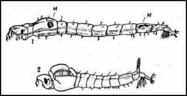 Личинки комаров. Увел. 1 — личинка коретры, или перистоусого комара (Corethra plumicornis): M — воздушные мешки; 2 — личинка мохлоникса, или комаровидного комарика (Mochlonyx culiclformis).