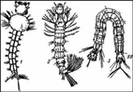 Личинки комаров. Увел. 1 — личинка обыкновенного комара (Culex pipiens); 2 — личинка малярийного комара (Anopheles maculipennis); 3 — личинка земноводного комарика (Dixa amphibia); gg — дыхательные отверстия, от которых начинаются два трахейных ствола.