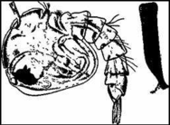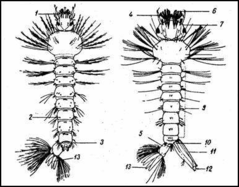 Тело личинки состоит из головы, груди и брюшка. На брюшке можно различить 9 члеников, покрытых щетинками. На последнем членике имеется пучок длинных щетинок, так называемое весло. Кроме того, на последнем членике можно различить 4 тонких листовидных придатка, называемых анальными жабрами (рис. 266). Размер личинок увеличивается с возрастом от 1 до 8-9 мм. Различают четыре возраста личинок, причем с возрастом иногда меняется окраска личинок. Личинки первого возраста — черного цвета, второго и третьего возрастов — черные или сероватые, личинки четвертого возраста обыкновенно светлеют и бывают зеленоватые или красноватые, но иногда сохраняют темную окраску.
