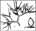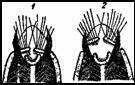 1 — яйца плавта в стебле растения (часть стебля вскрыта); 2 — ловчая нога плавта.