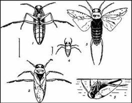 Размножение. Животные откладывают яйца в подводные растения. Вышедшие из яиц личинки быстро растут. Они часто попадаются на экскурсиях и очень напоминают взрослых гладышей, отличаясь от них несколько иной формой, отсутствием крыльев, размерами и более бледной окраской (4).