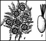Яйца гребляка (Corixa geoffroyi). 2 – отдельное яйцо (сильно увел.)
