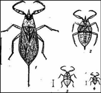 Водяной скорпион (Nepa cinerea). (Ориг.) 1 — взрослый экземпляр; 2-4 — различные стадии развития личинок.