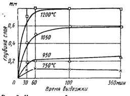 Рисунок 4 - Изменение глубины газонасыщенного слоя при различных температурах в зависимости от времени выдержки.
