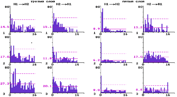 Для верхних слоев показано (рис. 2) появление на ПИГ после электрической стимуляции дополнительных длиннолатентных значимых пиков и уменьшение пиков с нулевой латентностью. В нижних слоях при этом наблюдалось ослабление как прямых, так и обратных межнейронных моно- и полисинаптических влияний и появление односторонних влияний с нулевой и высокой латентностью.